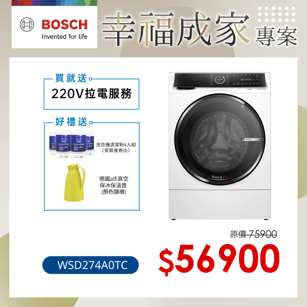 【BOSCH】12公斤智慧三效洗脫烘滾筒洗衣機 WSD274A0TC【含運+拆箱定位+免費220V拉電】