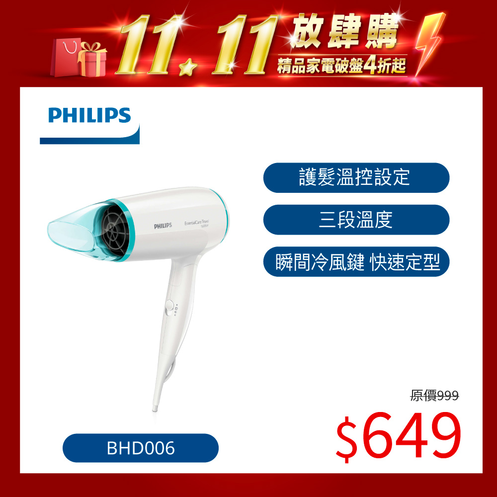 【1111 放肆購】Philips 飛利浦旅行用輕巧折疊超靜音吹風機 BHD006 (國際電壓)
