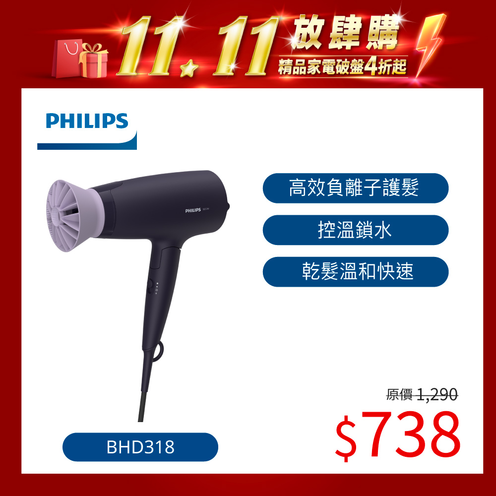 【1111 放肆購】Philips 飛利浦溫控負離子護髮吹風機(夕霧紫) BHD318
