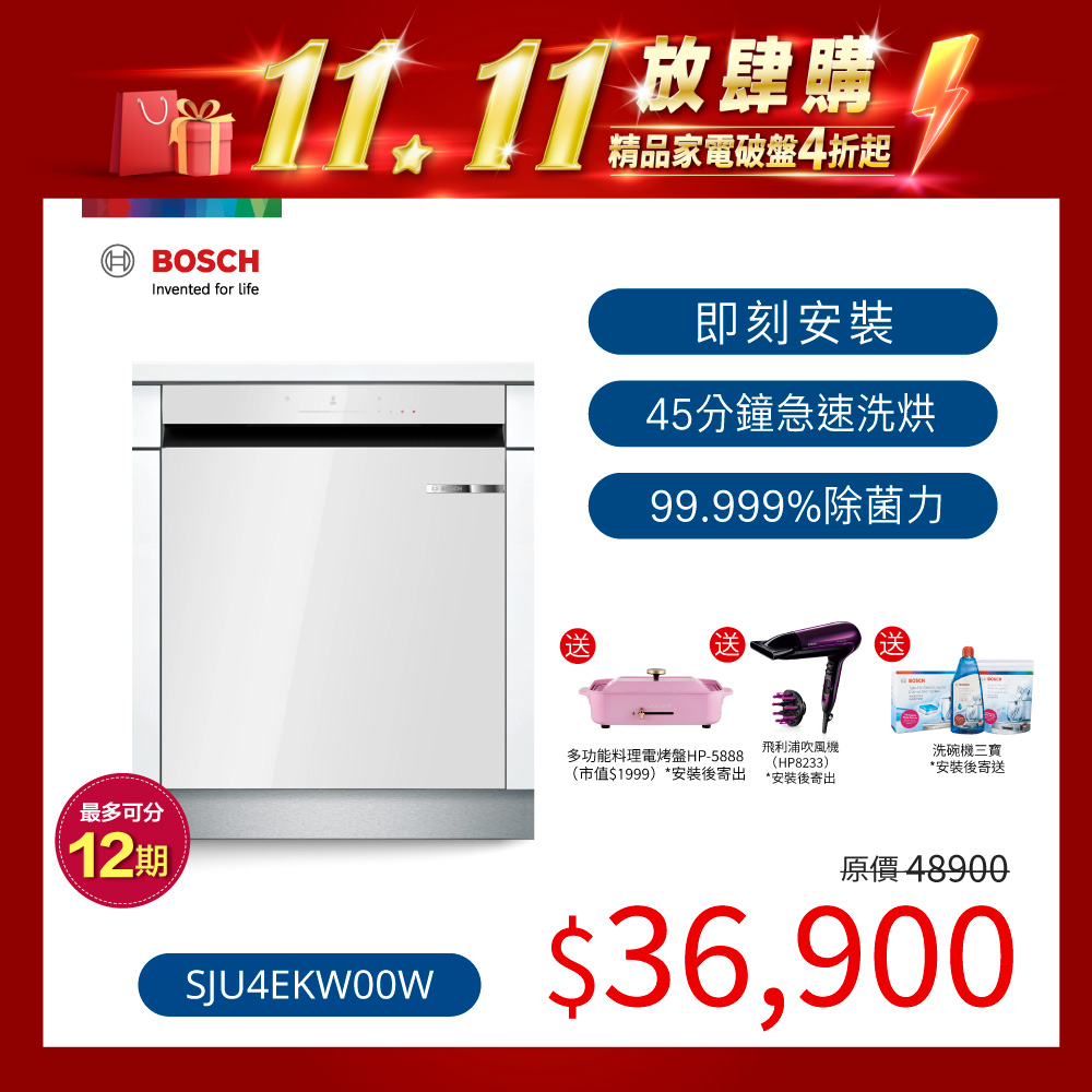 【1111 放肆購】BOSCH 4系列 60公分下嵌式晶緻白美型玻璃洗碗機15人份(SJU4EKW00W)【含運+標準安裝】