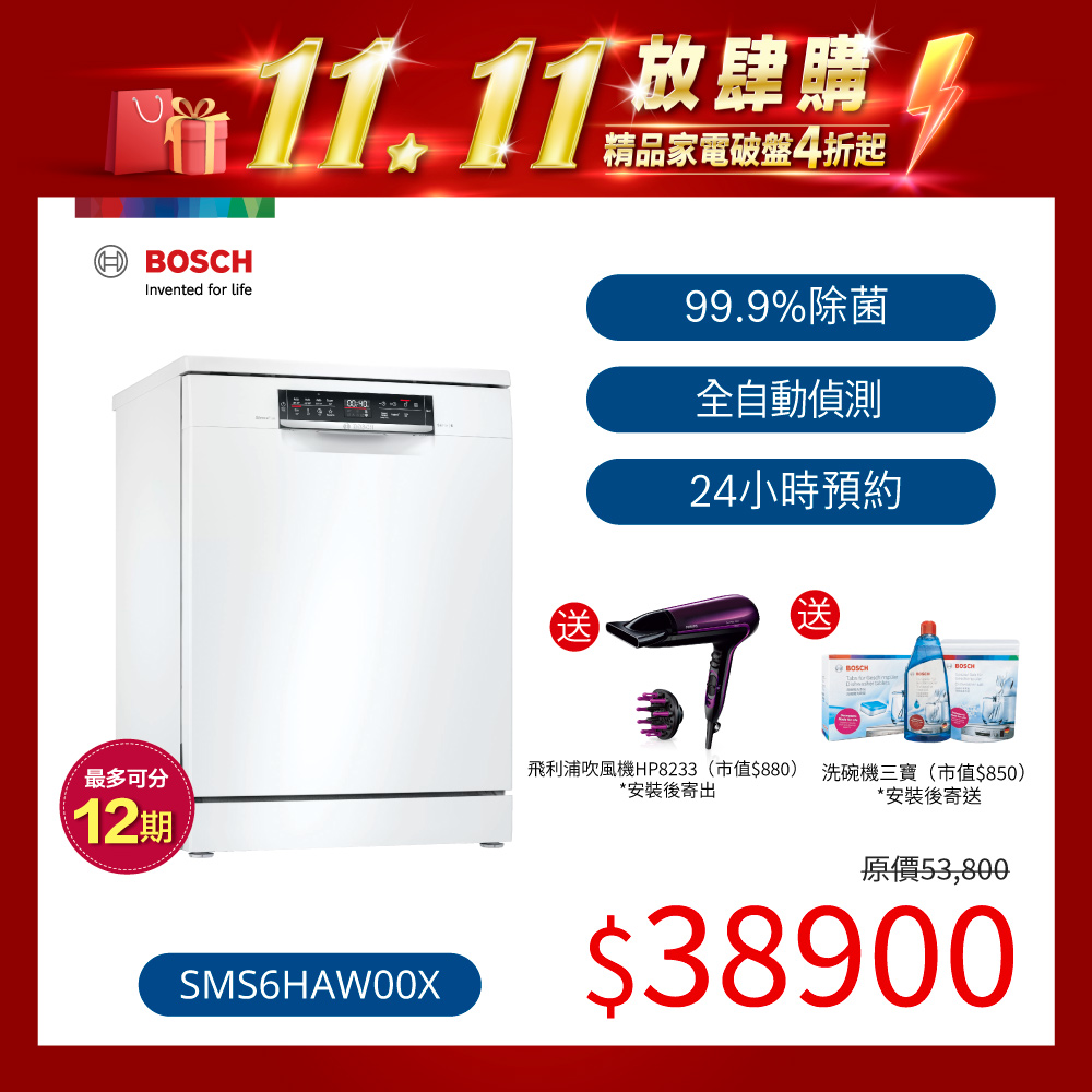 【1111 放肆購】BOSCH 6系列 60公分獨立式洗碗機 13人份(SMS6HAW00X)【含運+標準安裝】