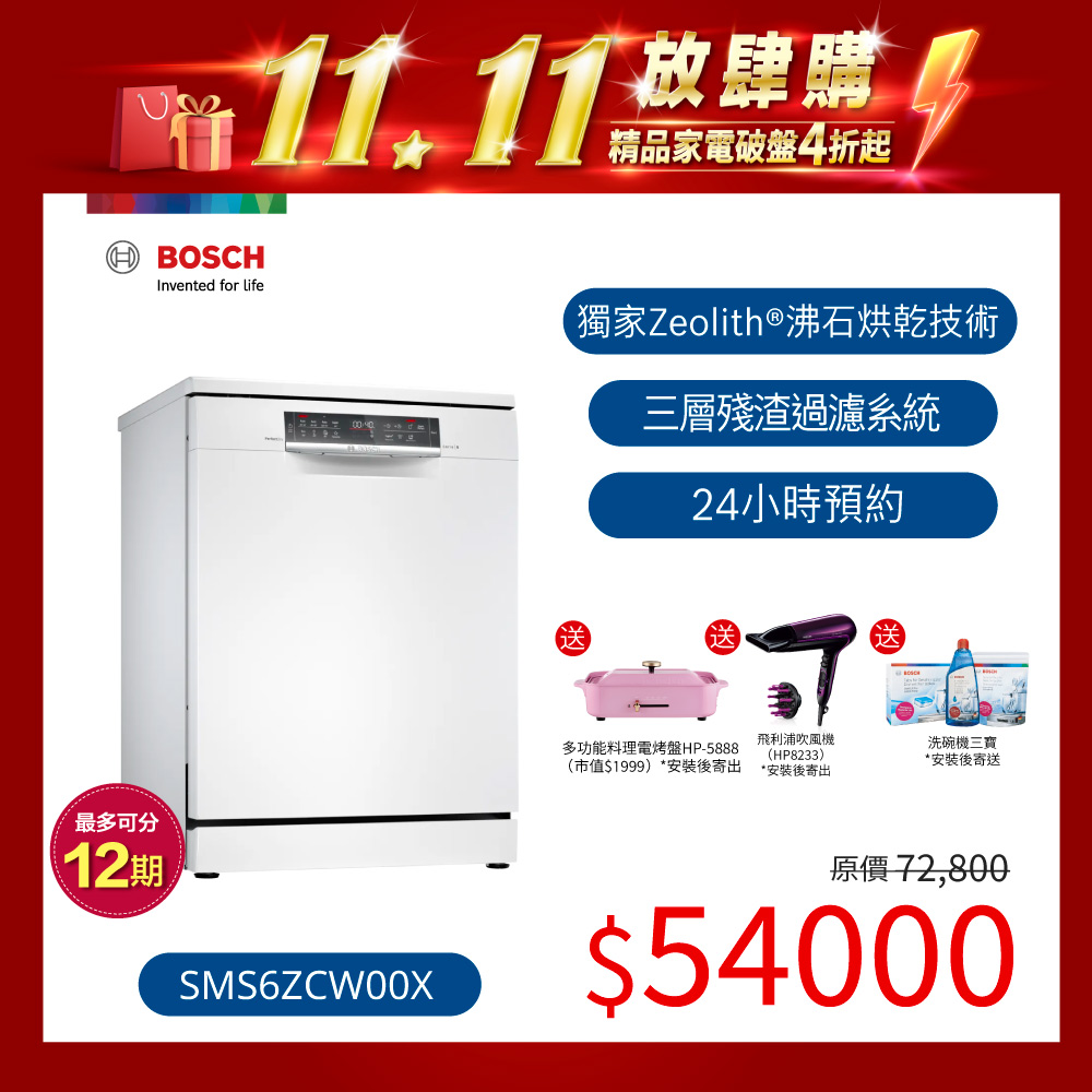 <預購>【1111 放肆購】BOSCH 6系列 60公分沸石獨立式洗碗機 14人份 (SMS6ZCW00X)【含運+標準安裝】