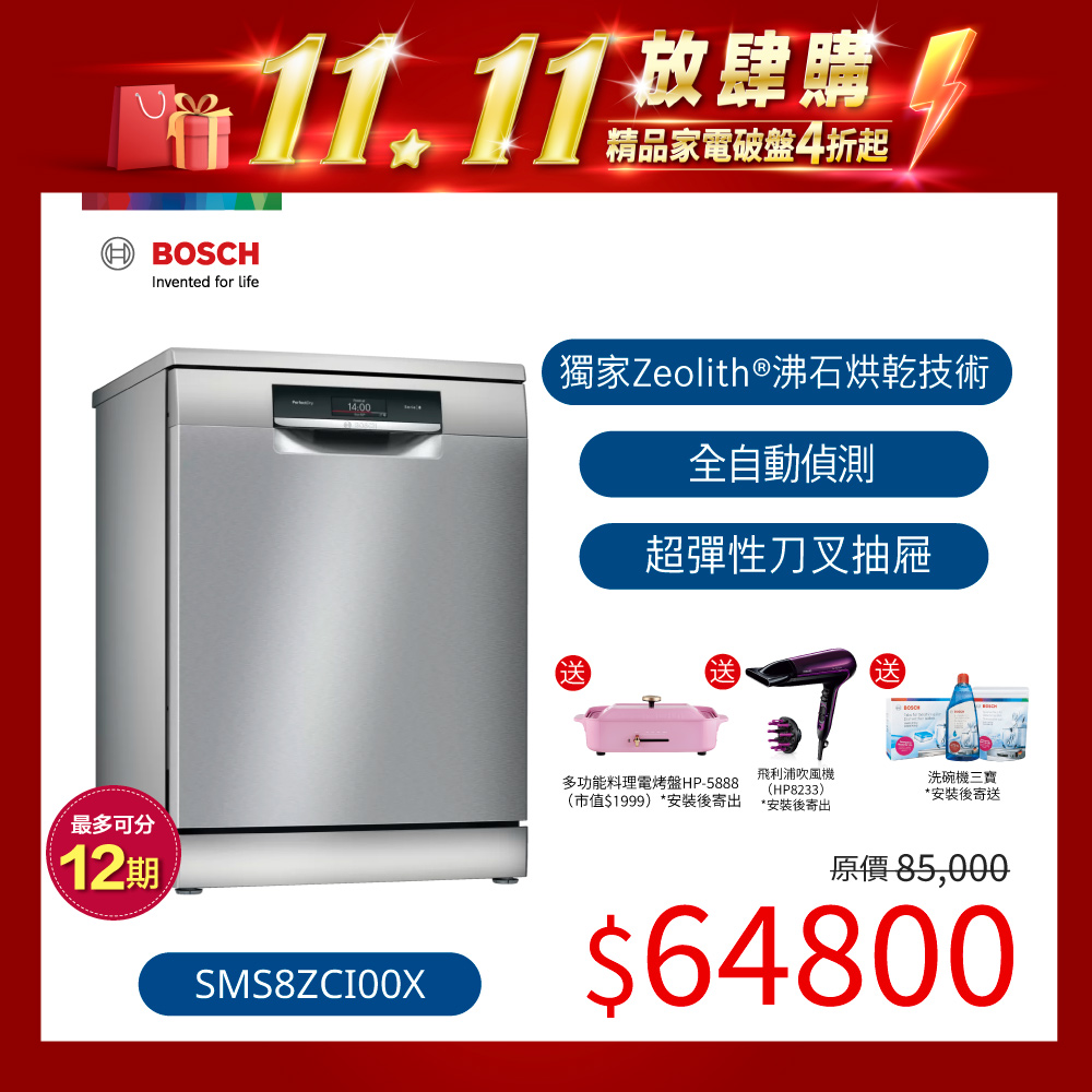 【1111 放肆購】BOSCH 8系列 60公分沸石獨立式洗碗機 14人份 (SMS8ZCI00X)【含運+標準安裝】