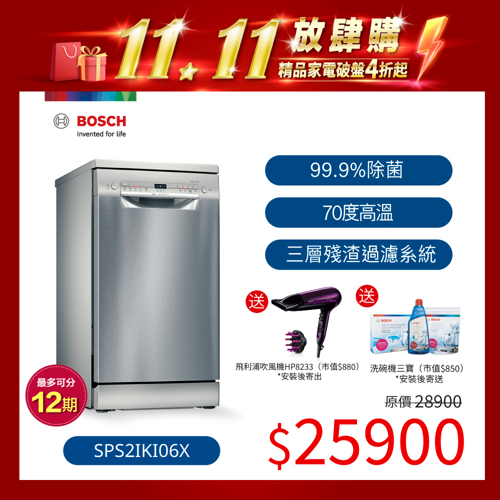 【1111 放肆購】BOSCH 2系列 45公分獨立式洗碗機 9人份(SPS2IKI06X)【含運+標準安裝】