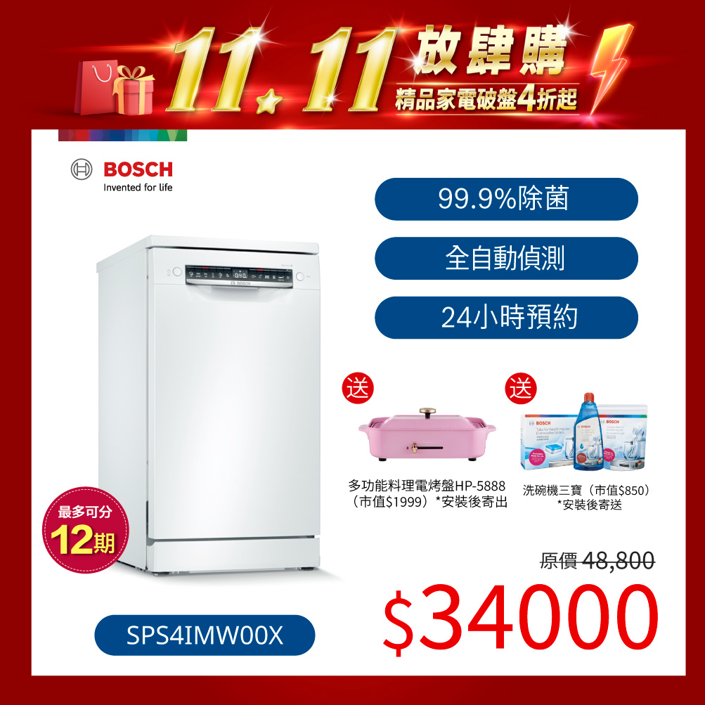【1111 放肆購】BOSCH 4系列 45公分獨立式洗碗機 10人份(SPS4IMW00X)【含運+標準安裝】