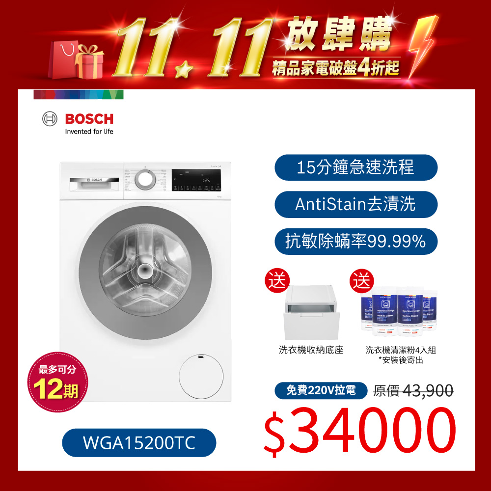 【1111 放肆購】BOSCH 10公斤去漬抗敏滾筒洗衣機 WGA15200TC【含運+拆箱定位+免費220V拉電】