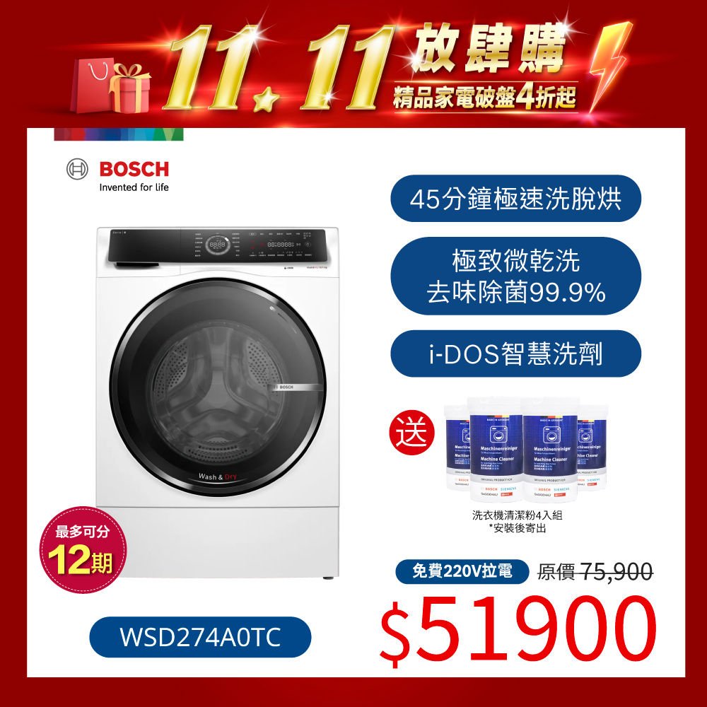 【1111 放肆購】BOSCH 12公斤智慧三效洗脫烘滾筒洗衣機 WSD274A0TC【含運+拆箱定位+免費220V拉電】