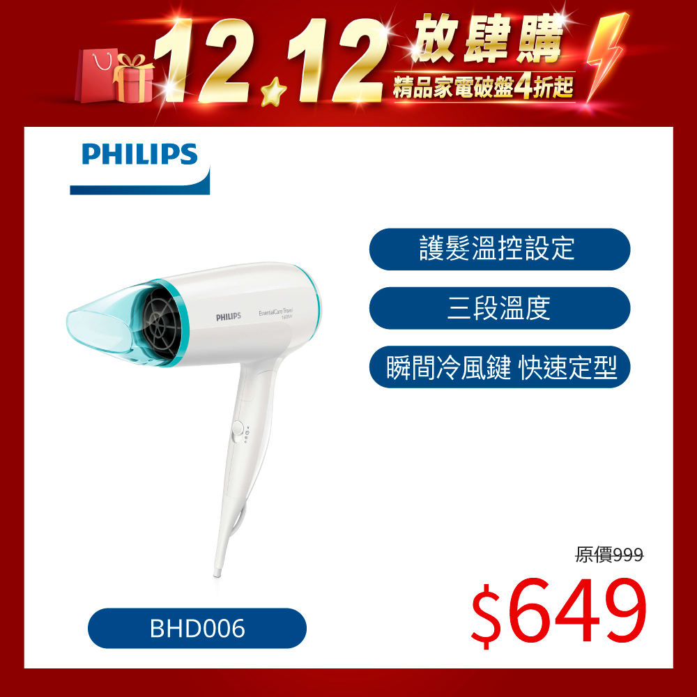 【1212 放肆購】Philips 飛利浦旅行用輕巧折疊超靜音吹風機 BHD006 (國際電壓)