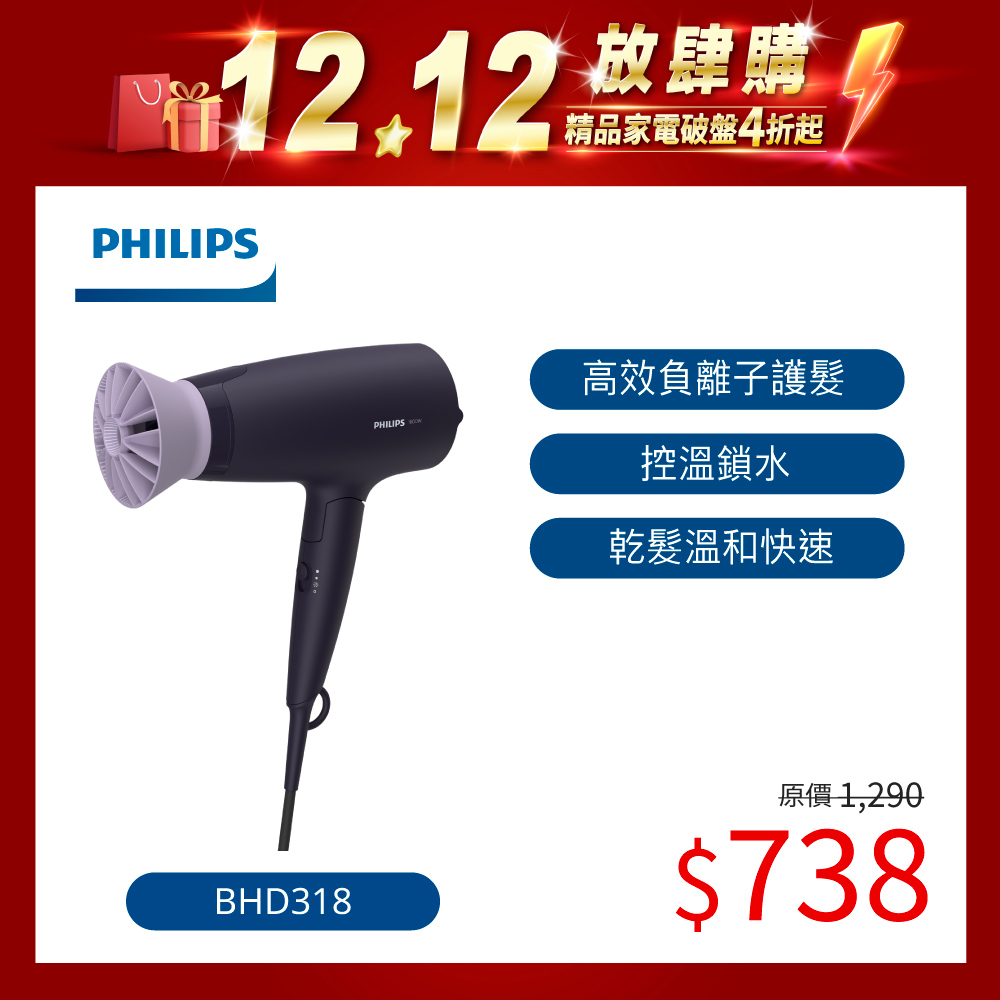 【1212 放肆購】Philips 飛利浦溫控負離子護髮吹風機(夕霧紫) BHD318