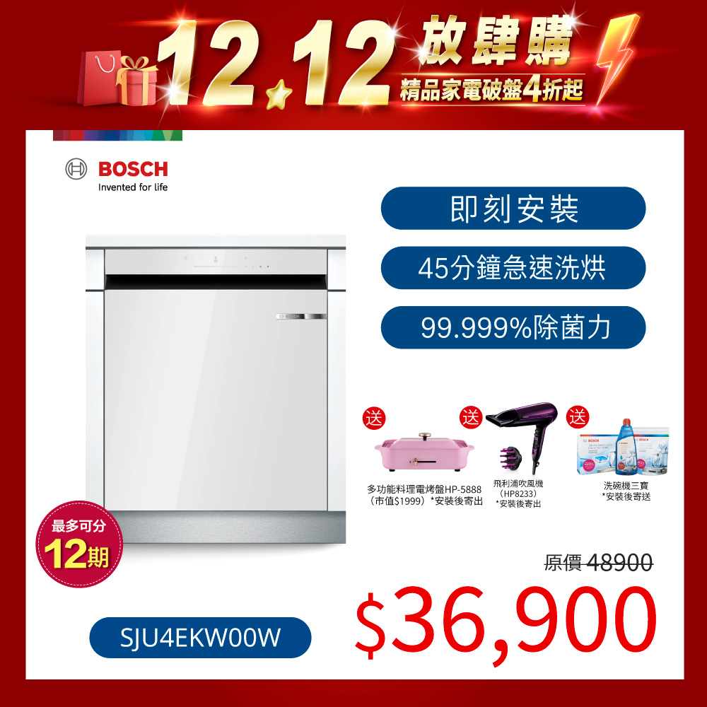 【1212 放肆購】BOSCH 4系列 60公分下嵌式晶緻白美型玻璃洗碗機15人份(SJU4EKW00W)【含運+標準安裝】