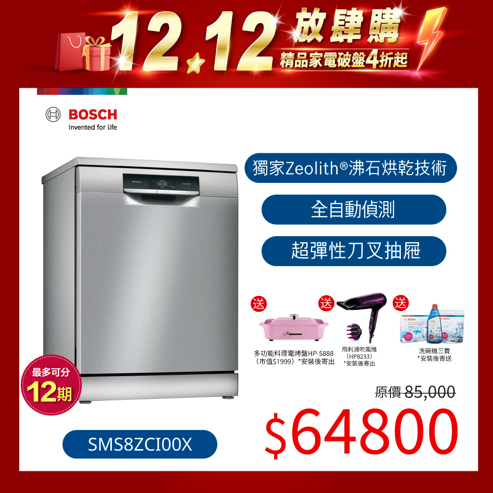 【1212 放肆購】BOSCH 8系列 60公分沸石獨立式洗碗機 14人份 (SMS8ZCI00X)【含運+標準安裝】