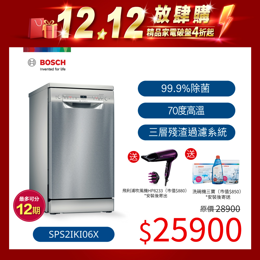 【1212 放肆購】BOSCH 2系列 45公分獨立式洗碗機 9人份(SPS2IKI06X)【含運+標準安裝】
