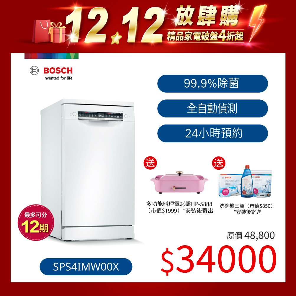 【1212 放肆購】BOSCH 4系列 45公分獨立式洗碗機 10人份(SPS4IMW00X)【含運+標準安裝】