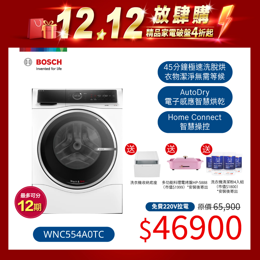 【1212 放肆購】BOSCH 10公斤三效極淨洗脫烘洗衣機 WNC554A0TC【含運+拆箱定位+免費220V拉電】