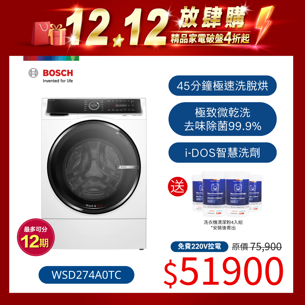 【1212 放肆購】BOSCH 12公斤智慧三效洗脫烘滾筒洗衣機 WSD274A0TC【含運+拆箱定位+免費220V拉電】