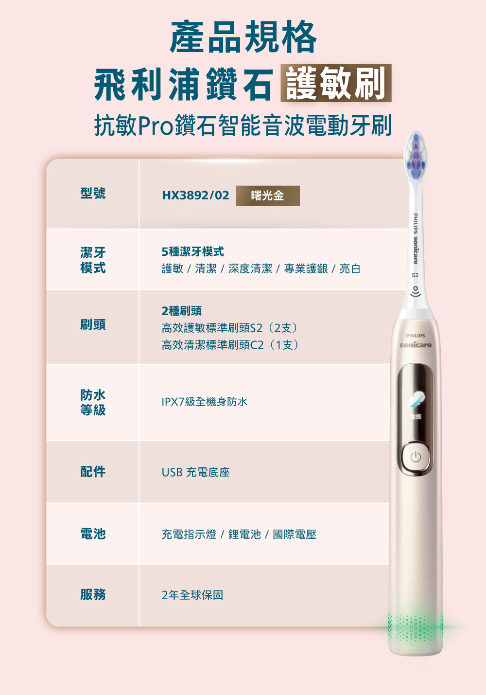 【Philips飛利浦】官方直營 Sonicare抗敏Pro 鑽石智能音波電動牙刷/護敏刷HX3892/02(雙入組)